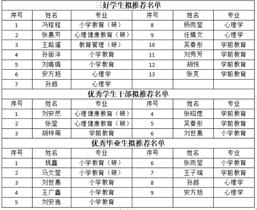 根据《牡丹江师范学院三好学生、优秀学生干部、优秀毕业生、先进班集体、 优良学风班评选办法》《校级研究生先优评选评选条件》,经个人申报,民主测评,学院先优评选领导小组评议,按照“公平、公正、公开、择优”的原则,评选出教育科学学院2024届毕业生校级三好学生13名,优秀学生干部6名,优秀毕业生9名,现将拟评定名单进行公示:
