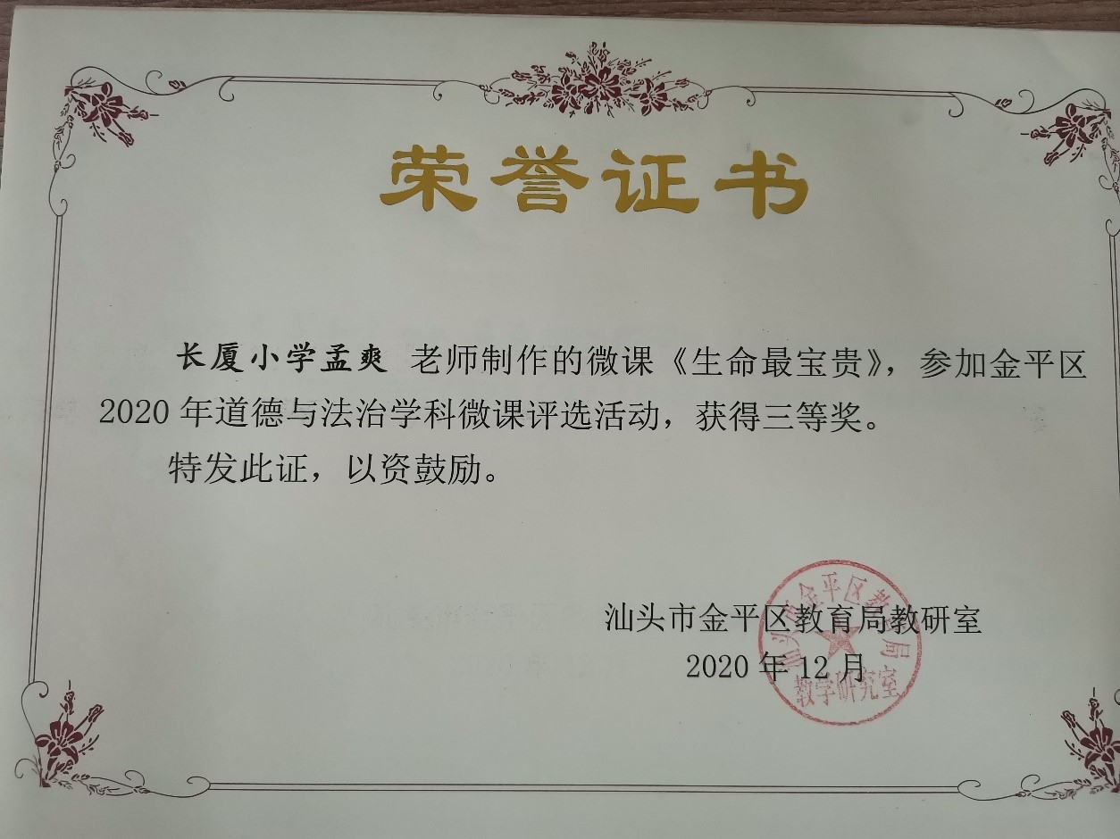 ③2021.1金平区道德与法治微课《生命最宝贵》三等奖;