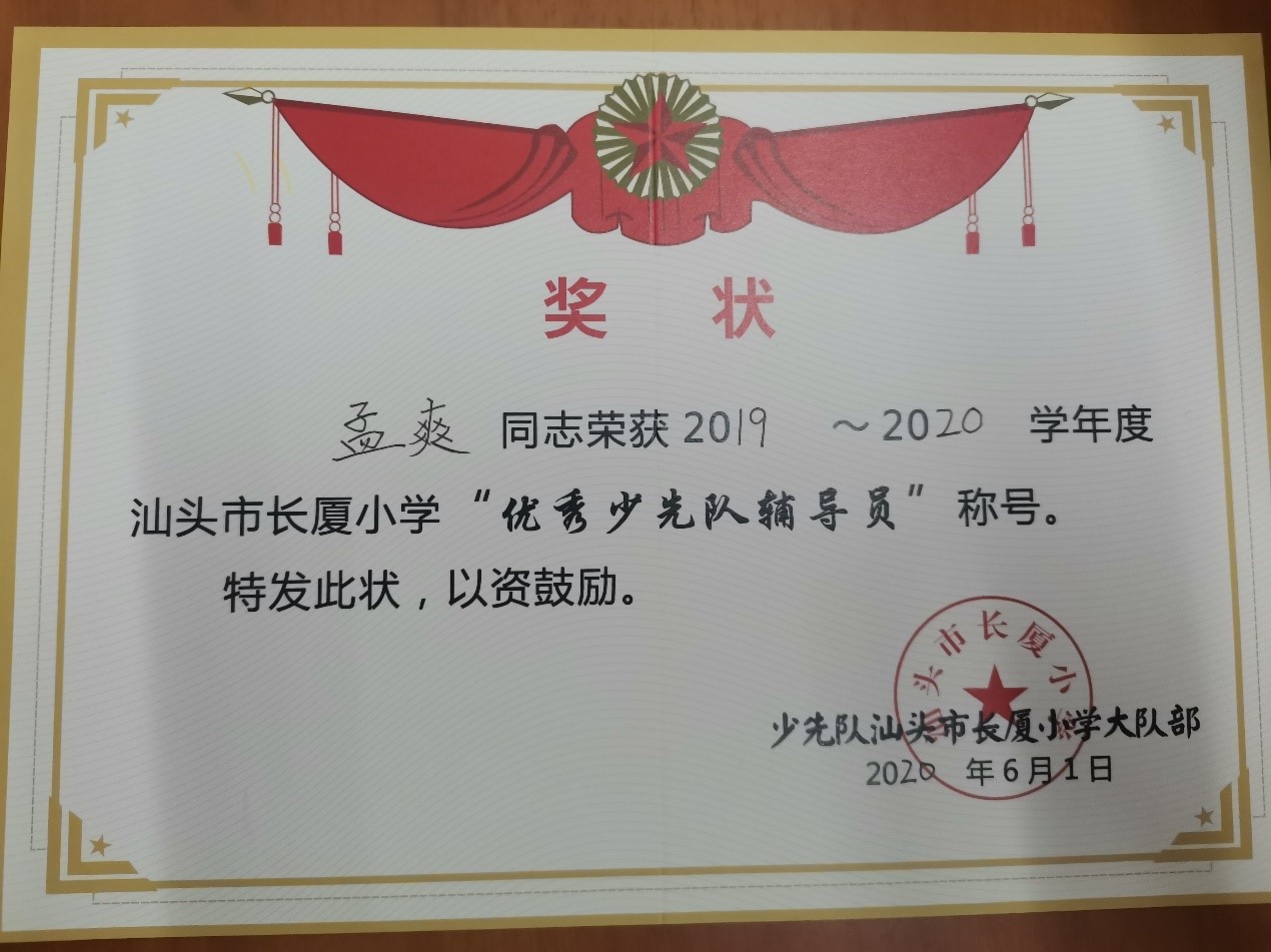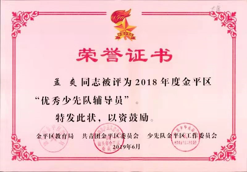 ①2019.6被评为2018年度金平区“优秀少先队辅导员”(金平区教育局)
