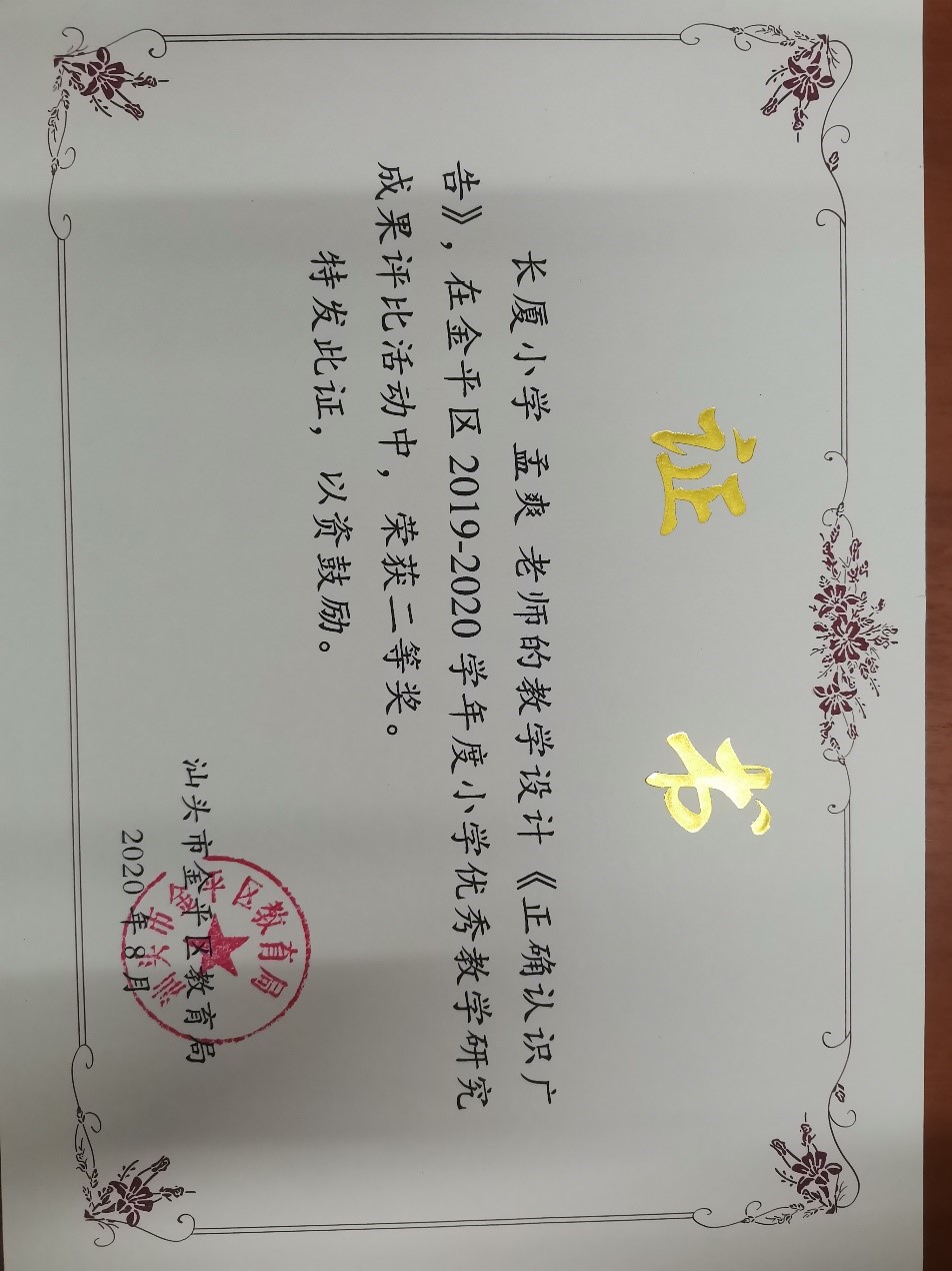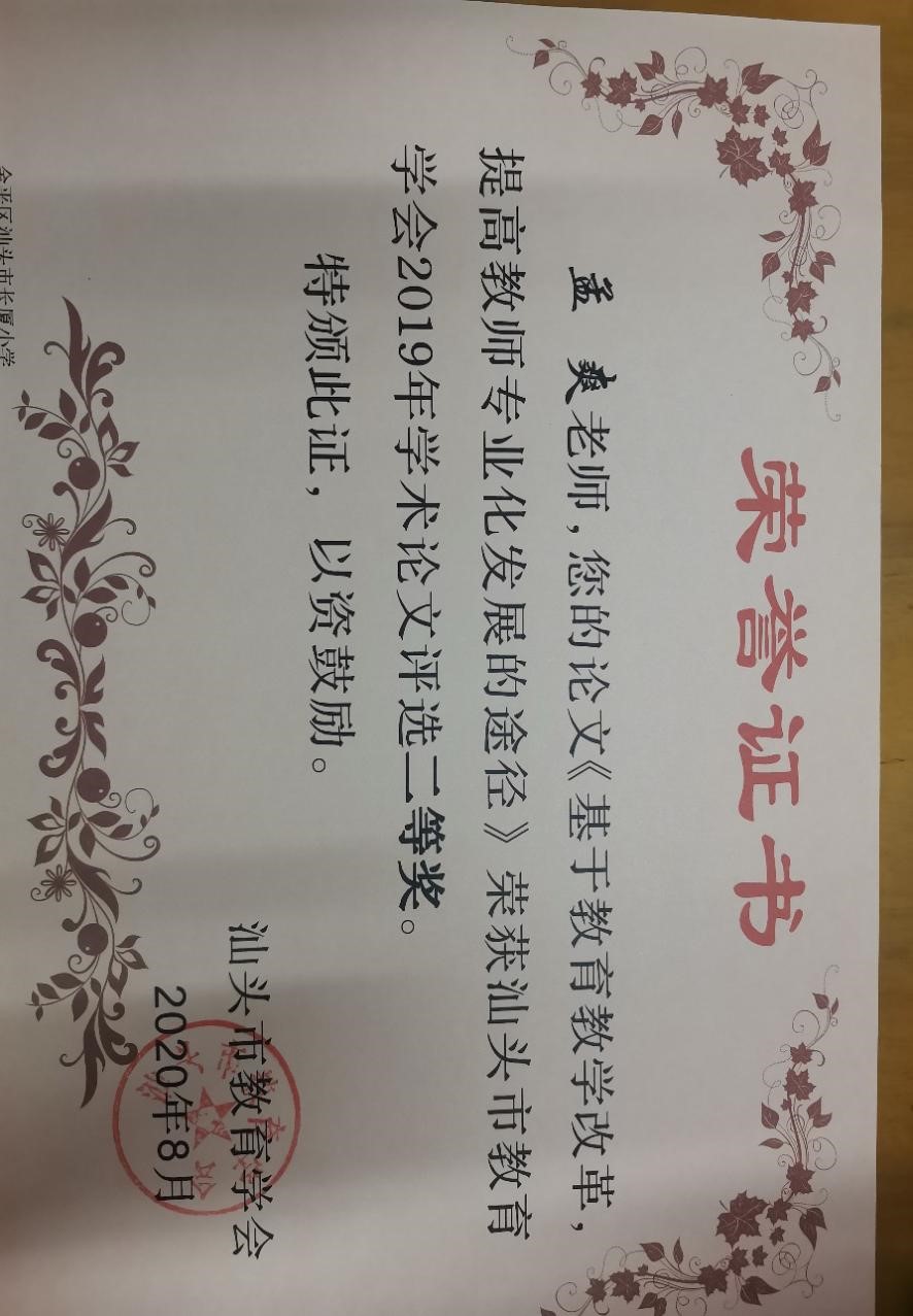 ①《基于教育教学改革,提高教师专业化发展途径》荣获汕头市教育学会2019年学术论文评选二等奖;