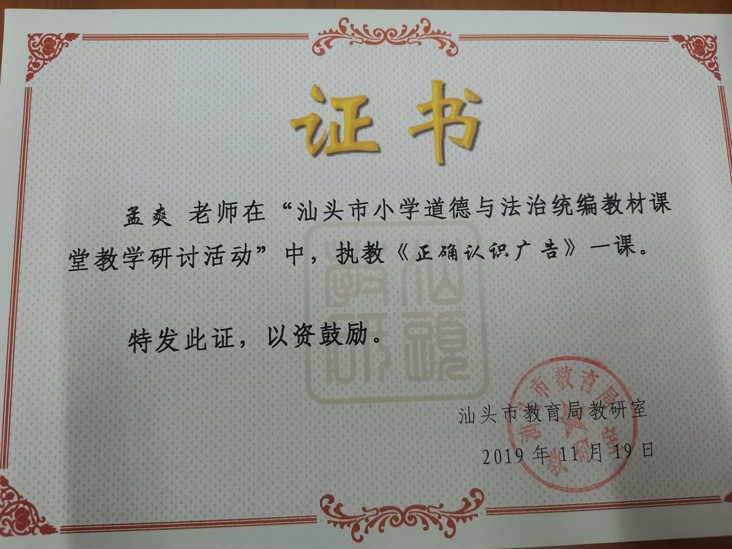 ①市级:2019.11.19汕头市小学道德与法治统编教材课堂教学研讨活动中执教《正确认识广告》(汕头市教育局教研室);