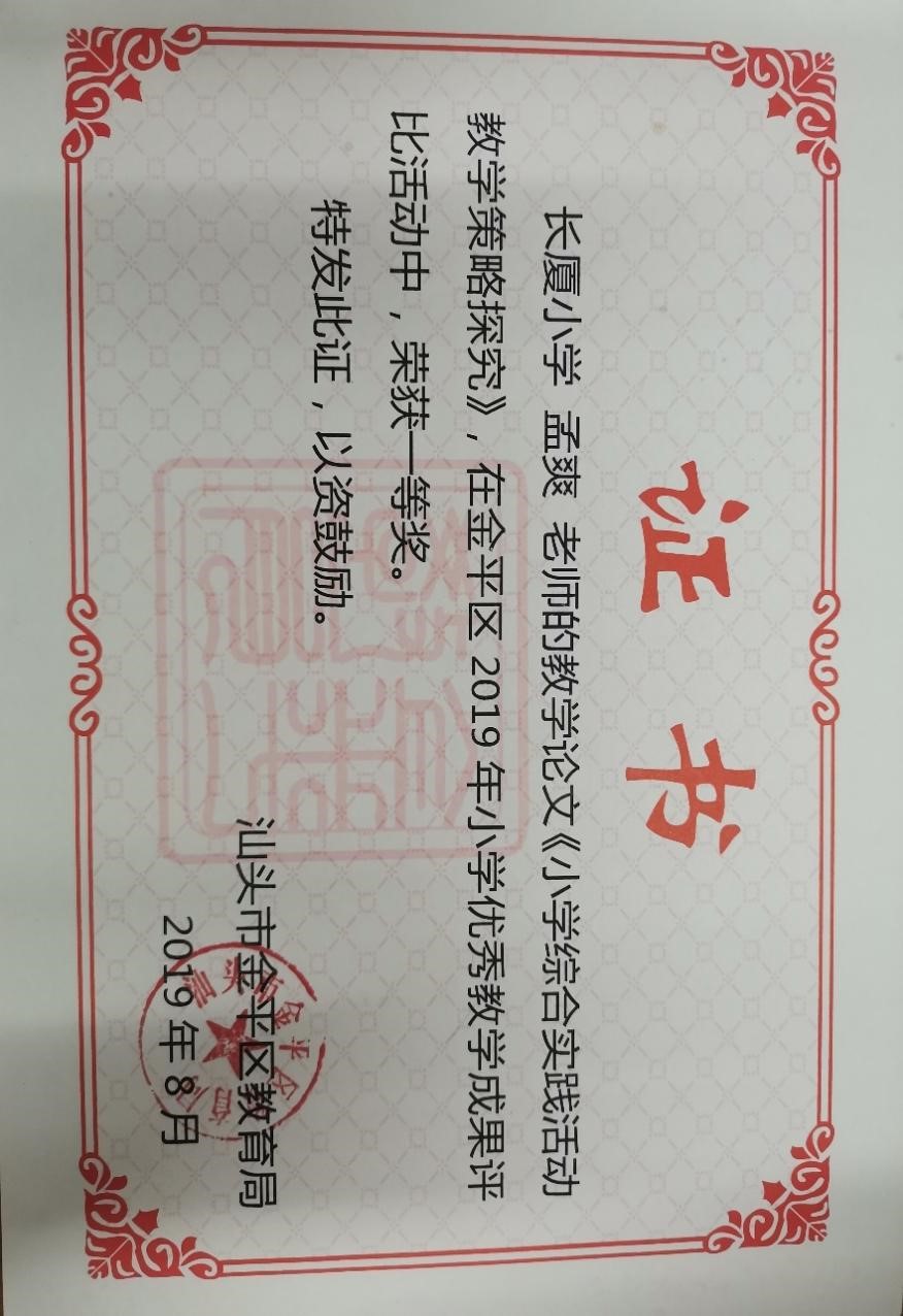 ②《小学综合实践活动教学策略探究》在金平区2019年小学优秀教学论文评比活动中,荣获一等奖;