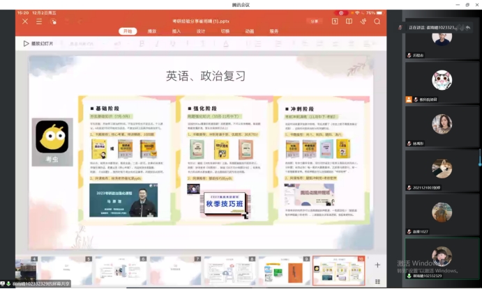 随后,崔雨晴学姐与同学们分享了自己的考研备考经历。崔雨晴学姐从时间安排,到每个科目的具体复习计划,从记忆的角度,到做题的技巧,从复习资料的选择,到帮助学习的小程序、APP等,为同学们提供了具体的复习指导与建议和同学们分享了考研择校问题以及自己的学习方法。她向同学们强调考研中坚定信念、明确目标的重要性,嘱咐同学们认真思考,明确专业和目标,在目标院校的选择方面,要避免盲目跟风,明确适合自己的才是最好的选择。此外,她还希望学弟学妹们在备研的过程中注意自己的身心健康,身体才是革命的本钱。