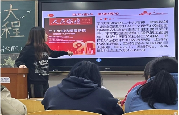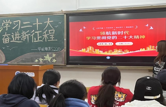 作为新时代,新青年,在二十大顺利召开的大背景下,我们要贯彻落实习总书记的重要思想,持续巩固深化拓展党史学习教育成果,进一步激发广大青年的爱国之情、报国之志、强国之责。为此,教育科学学院2022级学前教育一班于2022年11月17日18:30在外语楼606开展以“学习二十大,奋进新征程”为主题的班会活动。