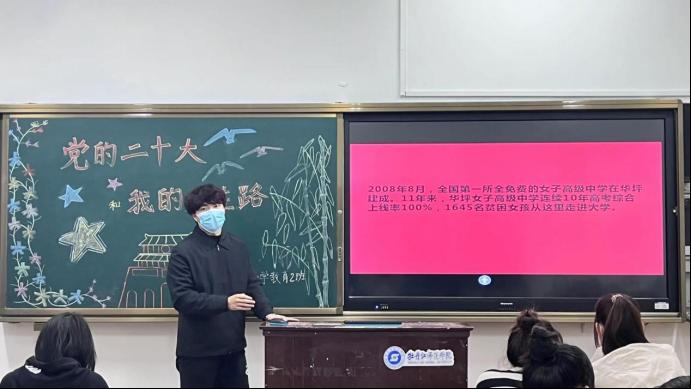 党的二十大是我们党进入全面建设社会主义现代化国家、向第二个百年奋斗目标进军新征程的重要时刻召开的一次十分重要的代表大会,是党和国家政治生活中的一件大事。为深入贯彻党的二十大会议精神,引导学生深入学习和全面深入领会党的二十大精神,在“学”字上下功夫,在“宣”字上有创新,在“行”字上见实效。教育科学学院2022级小学教育二班于11月16日19:00在外语楼608开展“党的二十大和我的人生路”青春使命教育主题班会,本次班会由班长窦琳程主持。
