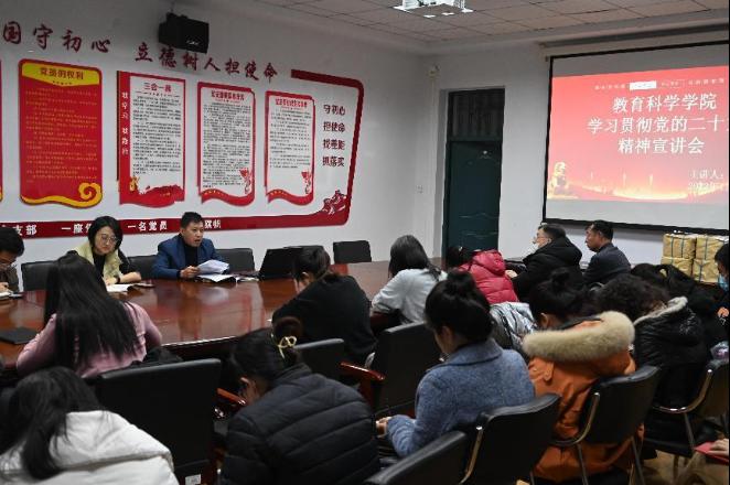 为深入学习宣传党的二十大精神,把全院师生的思想统一到党的二十大精神上来。我院于2022年11月23日下午3时在文科楼222召开“贯彻党的二十大精神宣讲会”,并在文科楼401设立分会场,我院党委书记笙长军同志担任主讲人,全体教师及学生党员参会学习。