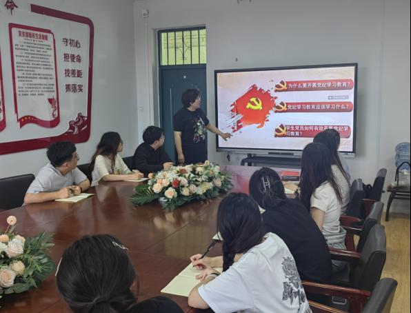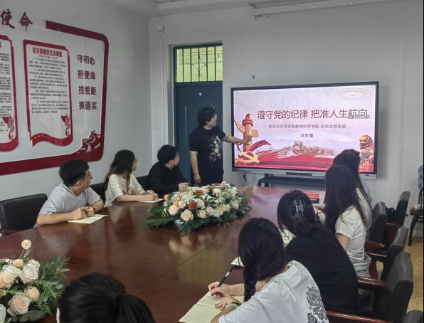 为深入贯彻习近平新时代中国特色社会主义思想,践行习近平总书记关于党的自我革命重要思想,营造学院学纪、知纪、明纪、守纪的良好氛围,推进党纪学习教育走深走实。我院研究生党支部书记远新蕾于2024年7月1日14时在文科楼222召开“遵守党的纪律,把准人生航向”主题党课。
